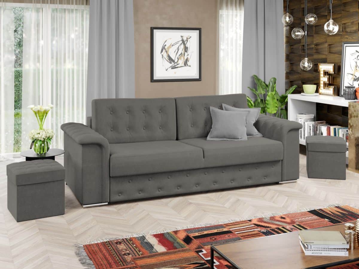 Canapea Olimp Aphrodite 22 Canapea Olimp Aphrodite 22 combina stilul si confortul, fiind alegerea potrivita pentru locuinta dumneavoastra. Nota eleganta este data de butonii decorativi prezenti pe brate, pe fata sezutului, pe cele doua perne detasabile, cat si de picioarele cu finisaj argintiu . Pe langa aspectul aparte, aceasta este prevazuta cu lada ideala pentru depozitarea lenjeriei, a pernelor sau a paturii si pentru a pastra la indemana toate articolele frecvent utilizate. Printre cele mai importante functii ale canapelei este capacitatea de a se transforma intr-un pat confortabil de 190 x 150 cm . Este recomandata atat pentru incaperi medii sau mari si are dimensiunea de: 250 cm lungime, 105 cm latime, 95 cm inaltime totala . Este tapitata cu o stofa premium uni pe diverse culori. Atentie: Pretul afisat nu include alte accesorii sau obiecte de decor. Taburetele, pernele deco si draperiile se pot achizitiona optional. Livrare gratuita si rapida, 4-10 zile lucratoare prin flota proprie Suntem producatori de tapiterii, fara intermediari Toate piesele de tapiterii au o garantie de 2 ani Sezutul si extensia canapelei sunt pe relaxa (arcuri elicoidale și poliuretan) . Scheletul este rezistent, realizat pe structura solida de fag si pal . Extensia este de tip Doppelliege, ce prezinta un sistem actionat prin role, astfel ca partea de sezut se trage si permite partii de spatar sa gliseze spre partea din fata si sa se pozitioneze orizontal. Canapea Olimp Aphrodite 22 se incadreaza cu usurinta in majoritatea locuintelor indiferent de stilul acestora. Puteti alege din mai multe culori pentru stofa. Produsele disponibile le puteti vedea aici Modele Olimp . Videoclipul contine alta nuanta decat cea de pe pagina produsului, acesta avand ca scop prezentarea familiei pentru a se reda in detaliu aspectul materialului. Dimensiuni Canapea Olimp Aphrodite 22 Lungime: 250 cm Latime: 105 cm Inaltime sezut: 46 cm Inaltime totala: 95 cm Inaltime fara perne: 72 cm Adancime sezut cu perne: 62 cm Adancime sezut fara perne: 85 cm Inaltime brate: 67 cm Lungime picior: 22 cm Inaltime picior: 4 cm Dimensiuni extinsa Lungime extinsa: 190 cm Adancime extinsa: 150 cm Tapiterie Canapea Olimp Aphrodite 22 Tapiteria produsului este din stofa Gri . Nuanta acestui produs nu este pretentioasa, mascheaza eventualele evenimente neplacute prin care se poate murdari sau pata si se integreaza perfect in majoritatea locuintelor. Intretinere: se recomanda ca praful sa se stearga cu un material textil moale (finet) umed si sa nu se curete cu agenti chimici (diluant, acetona). Imaginile sunt cu titlu de prezentare si pot avea mici diferente de nuante in functie de display. Dimensiunile sunt exprimate în centimetri și pot oscila între ± 50 mm.