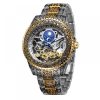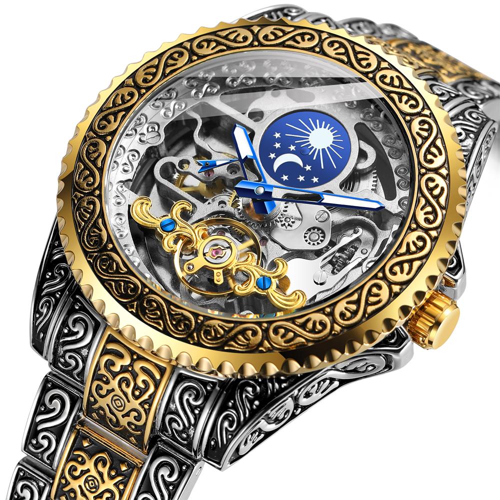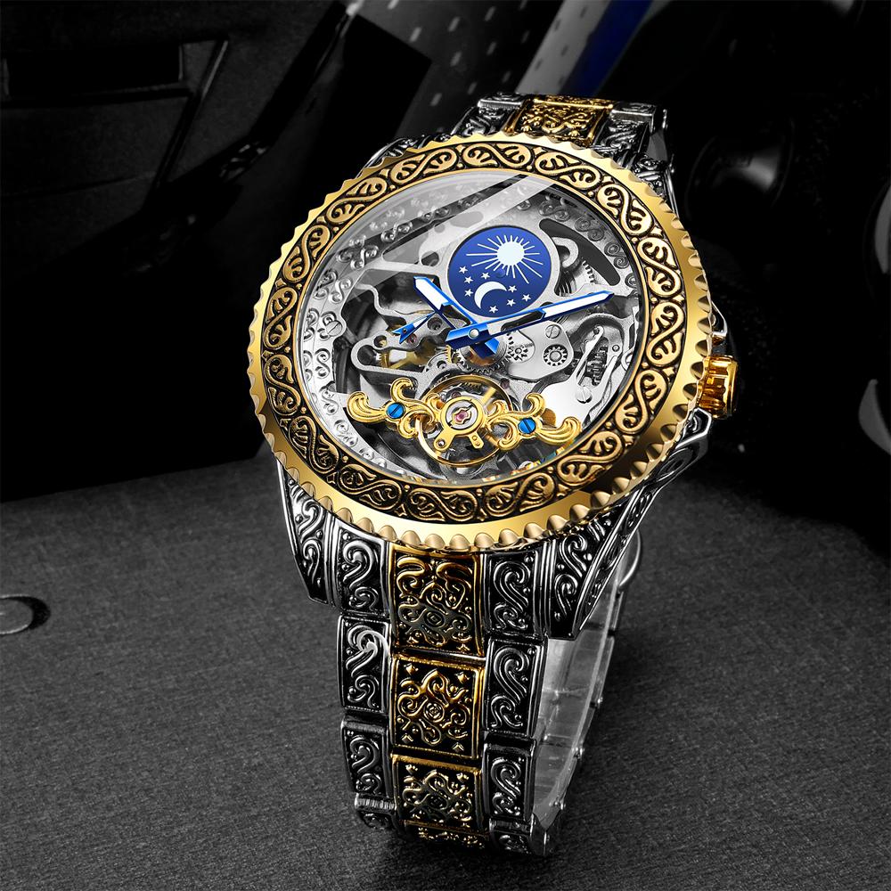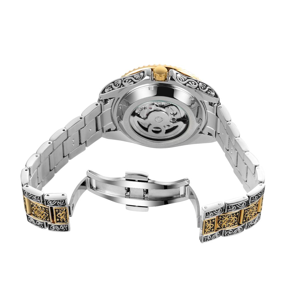 Specificatii: Marca: Forsining Mecanism: Automatic-Mecanic Forma Carcasei: Rotunda Caracteristici: Rezistent la soc Cadran: Schelet, Transparent Material Cutie: Carton Material Bratara: Otel inoxidabil Latime Bratara: 20 mm Grosimea Carcasei: 15 mm Lungime Bratara: 20 cm Tip Inchidere Bratara: Inchizatoare cu siguranta Material Carcasa: Aliaj Diametru Cadran: 43.5 mm Greutate: 134 g Rezistenta la apa: Nu Sex: Barbatesc Stil: Fashion & Casual Tipul de Afisaj: Analogic(ore, minute, secunde, Moon Phase(arata noapte/zi)) Material Geam Cadran: (Hardlex) Cristal Mineral Durificat Rezistent la zgarieturi Pachetul include: 1 x Ceas automatic-mecanic. 1 x O cutie din carton Forsining.